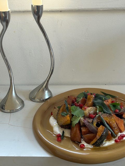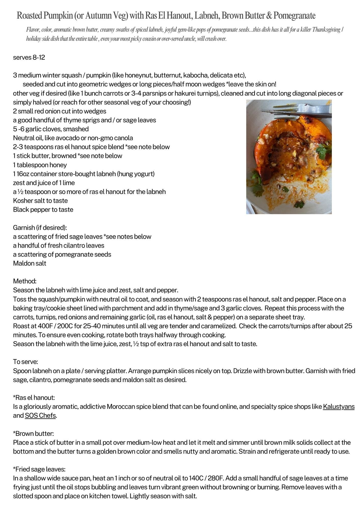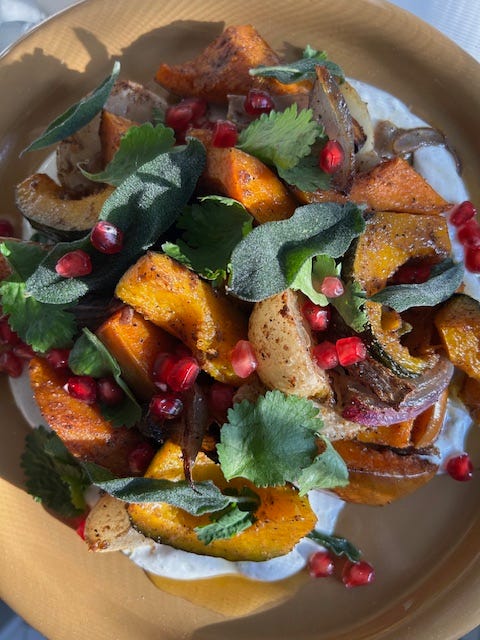 roasted pumpkin/squash with spiced labneh, brown butter, sage & pomegranate looks good with turkey