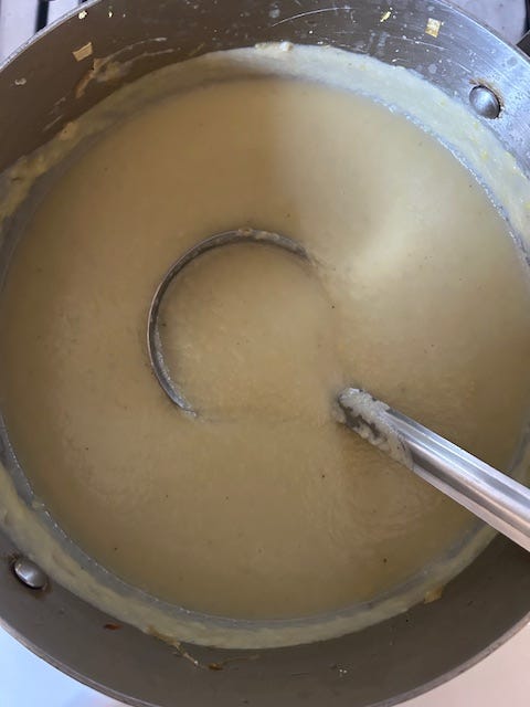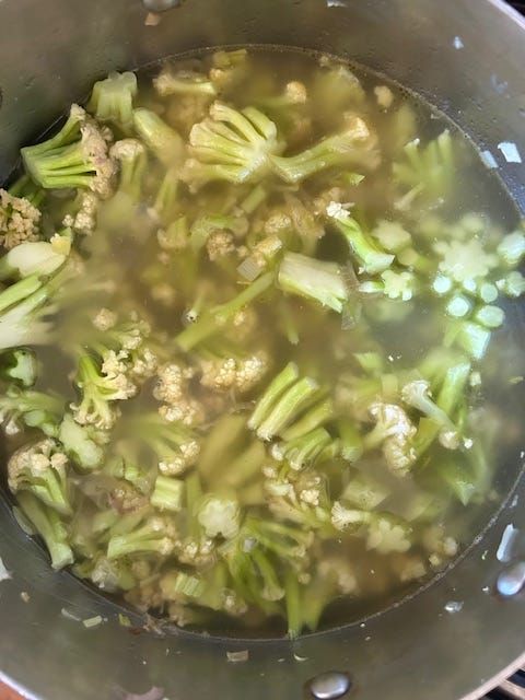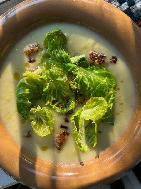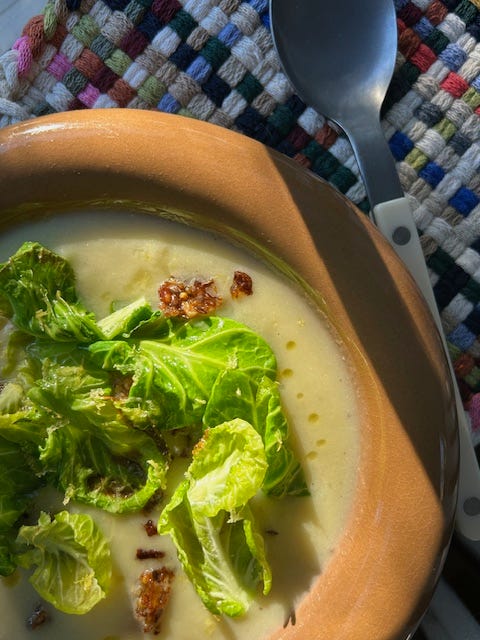 We have hit the first streak of real cold weather (under 40F / 10C), which means - for me at least - soup season is officially game on. I happened to spot some gorgeous sprouting cauliflower at the market last weekend — it’s just like normal cauiflower, but looks like a sprouted hand instead of a bulbous head and it tends to be even more delicious and flavorful — which sparked a long-ago tucked away memory of a soup, probably one of my favorites, from my former cafe, Nourish. The origins of this soup run at least 15 years now, and somehow I’ve left it dormant in recent winters. No more, joyful, bowl-filling resurrection has commenced and it’s left me, and hopefully you, very satisfied. In under 20 minutes (ok, maybe 25 with some sauteeing time), you can blitz this soup up into velvety goodness and top it off with anything that sounds delicious to you / or anything that is lying around in your fridge…lemon zest, seared Brussels sprout leaves, crispy bits of bacon, a grating of parmesan or gouda, some chili oil or flakes, old sourdough or rye bread crisped with garlic into craggy croutons/breadcrumbs, or simply a pinch of flaky sea and nice olive oil.